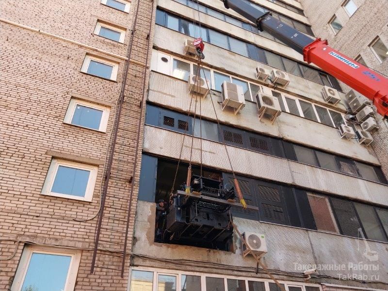 После того, как оборудование было доставлено в Санкт-Петербург, наша такелажная бригада встречала грузовик на месте выгрузки с автокраном. Далее по отработанной схеме станок застропили и подали в технологический проём на втором этаже. Занесли станок и установили на масленый поддон на месте эксплуатации.