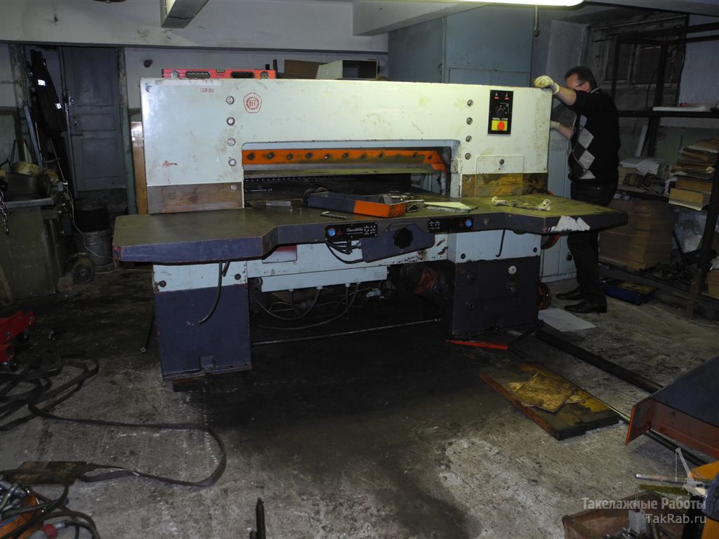 На самом деле это был второй этап такелажных работ. В первую очередь необходимо было осуществить вынос из подвального помещения старой одноножевой бумагорезальной машины БР-139, эта такелажная работа, по своей сложности, не уступала второму этапу.