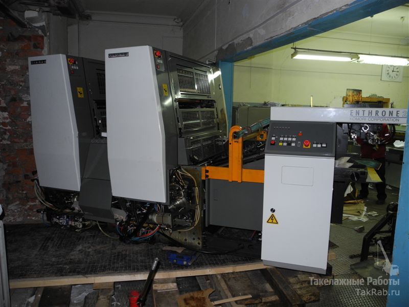 Так же секции печатной машины были поставлены на такелажные платформы с широкой колёсной базой, что позволило стабильно их перемещать в цехе, входить в повороты и выполнить сложнейший разворот тяжёлой секции на 180 градусов.