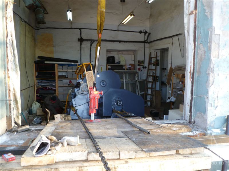 Данная работа осложнялась тем, что необходимо было 4-х тонный тигельный станок подать в окно на первом этаже. Для выполнения работы был сооружён пандус со скатом в помещение. Работа выполнялась в сильные морозы, но на качестве нашей работы это не сказалось. Тигельный пресс был установлен в помещении и приготовлен к запуску.