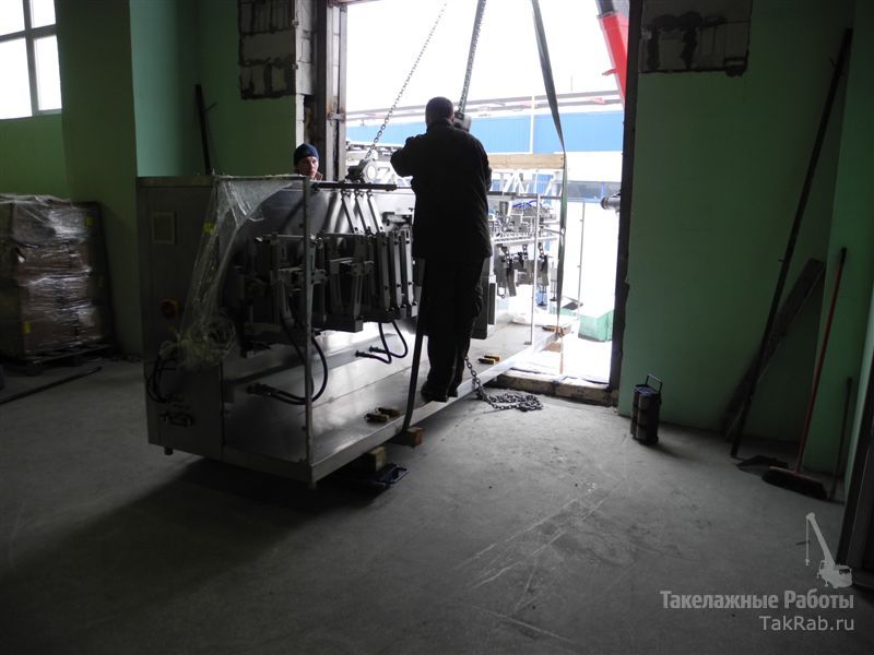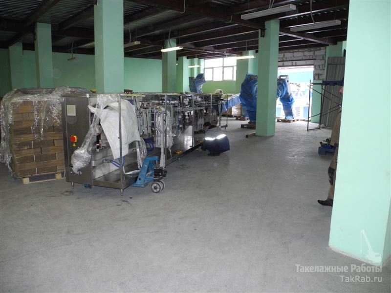 Заказчик, с пищевой промышленности, поставил задачу снять с транспортных поддонов новые фасовочные линии и подать их в технологический проём на втором этаже. Туда же необходимо было подать и транспортёры.