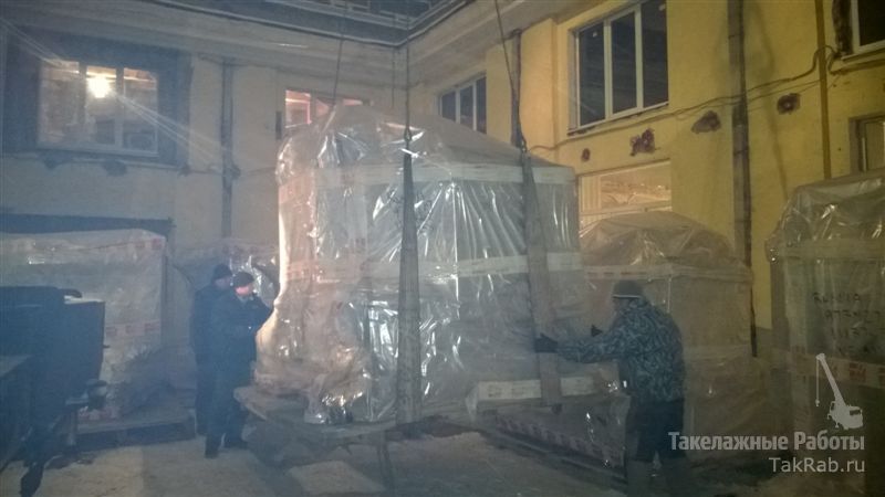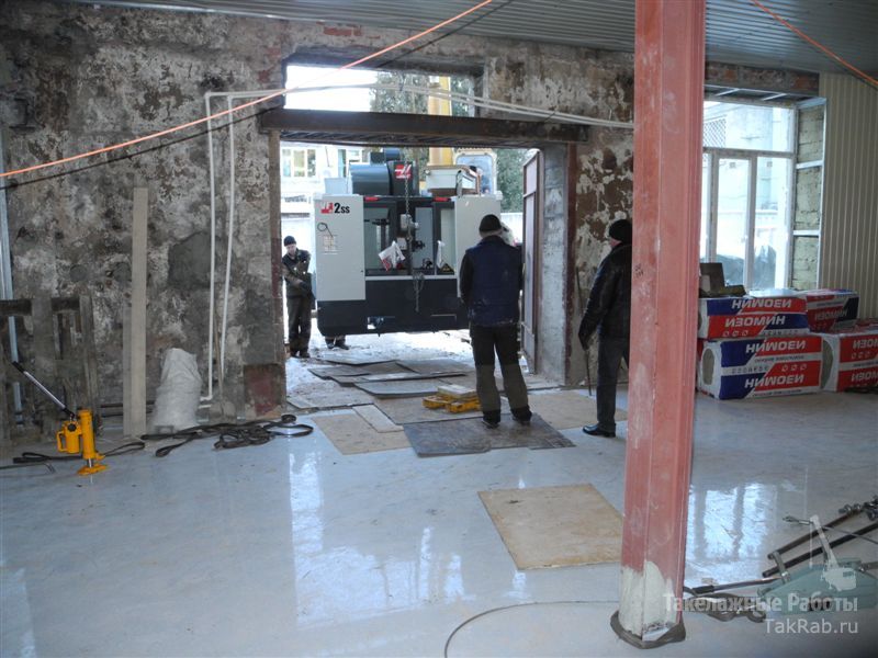 После демонтажа упаковки, дальнейшей застропки станков, они поднимались с транспортных поддонов и подавались к такелажному проёму. Далее станки ставились на такелажные платформы и перемещались к месту установки. После этого с помощью гидравлических домкратов оборудование снималось с такелажных платформ, и устанавливались на установочные опоры. После этого наша часть работы считалась выполненной.