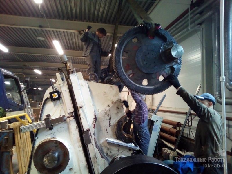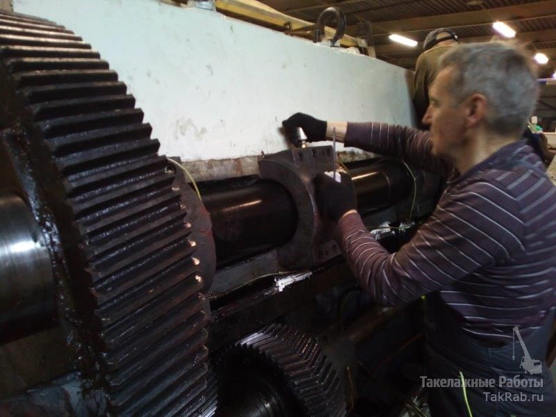 Осуществили демонтаж вала с шестернями, рычагов и прочих деталей с помощью автоманипулятора и специального такелажного инструмента. Автоманипулятор пришлось использовать т.к. вес вала с шестернями превышал 1000кг. После изготовления новых втулок детали пресса были успешно смонтированы в обратном порядке.