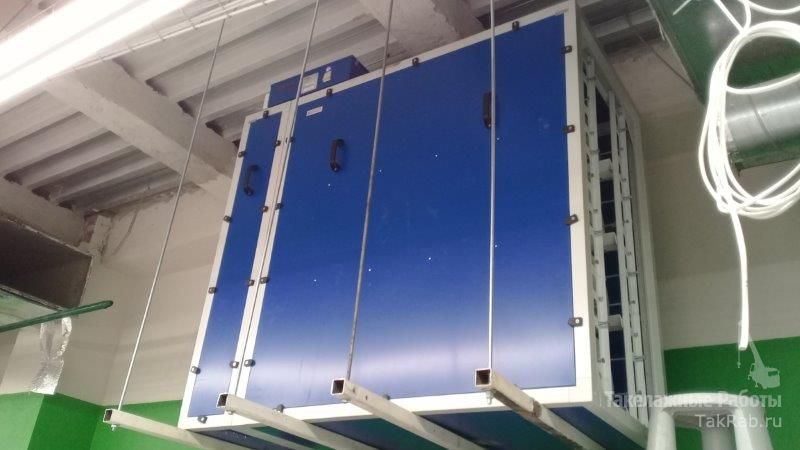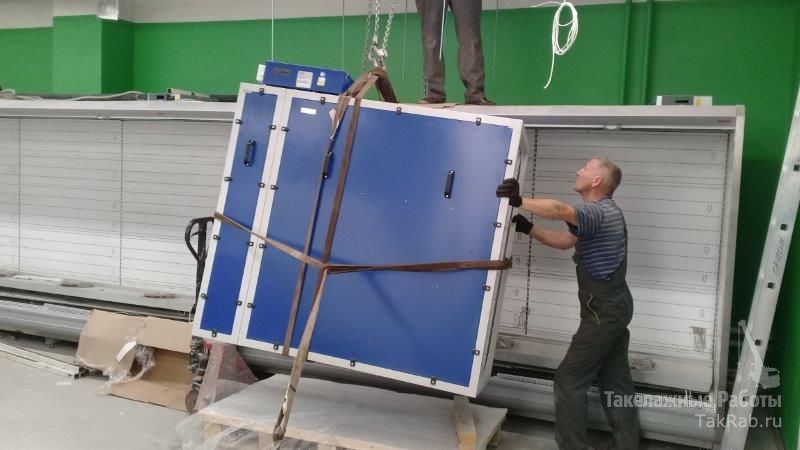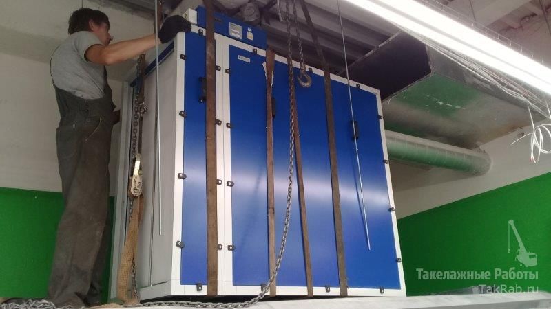Реконструкция магазина проходила в оперативном режиме. После расстановки торгового оборудования, выяснилось, что необходимо повесить фильтр TION массой более 400кг. к потолку. Из-за стеснённых условий в торговом зале потребовалась помощь такелажников с необходимым такелажным оборудованием. При подъеме фильтра применялись рычажные тали, стяжные ремни, стропы и прочий такелажный инструмент.