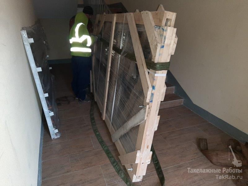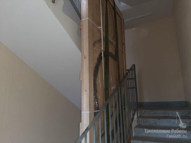От заказчика поступила задача в целостности и сохранности поднять на 19 этаж плиту из оникса. Так как габариты плиты не позволяли поднять её грузчикам на ремнях по лестничным маршам, пришлось за дело браться нашей такелажной бригаде. С помощью такелажного оборудования мы произвели подъём упакованной плиты между лестничными маршами.