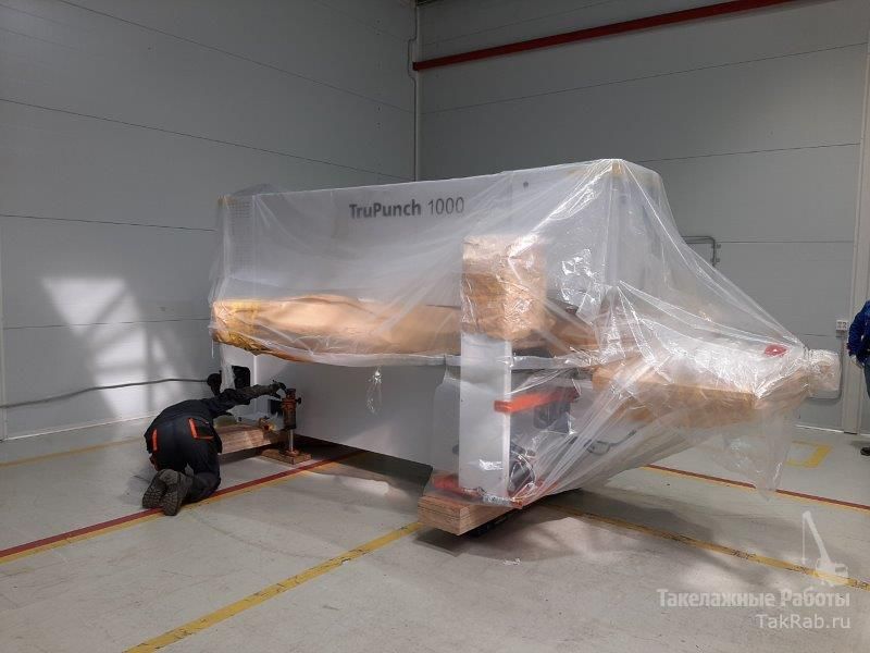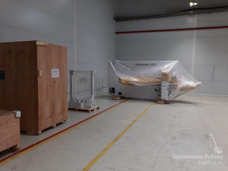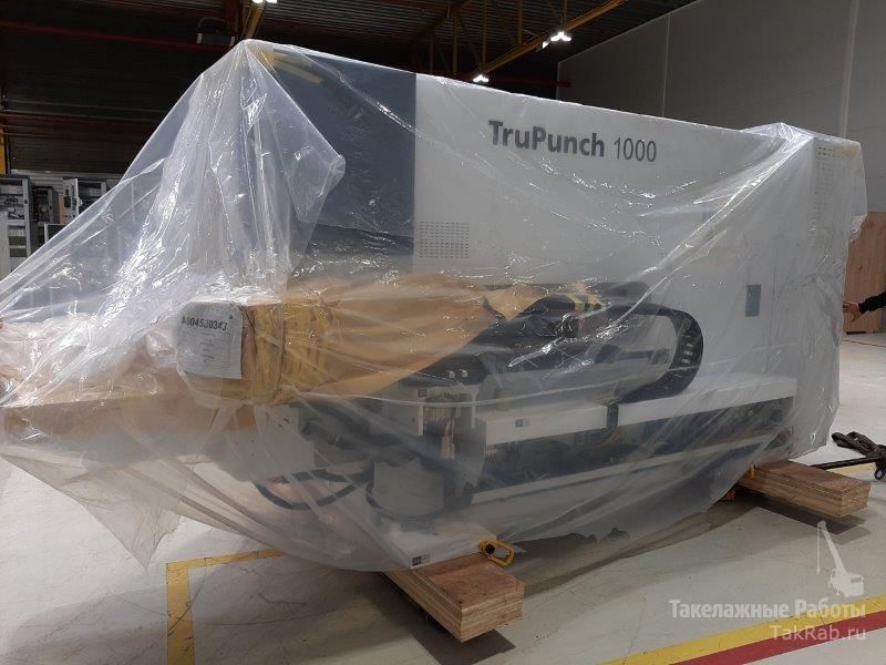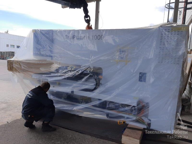 Выгрузка станка для координатно-пробивных работ TruPunch 1000 осуществлялась с помощью мощного автоманипулятора. Работа с автоманипулятором позволила безопасно подать станок на пандус под козырьком.