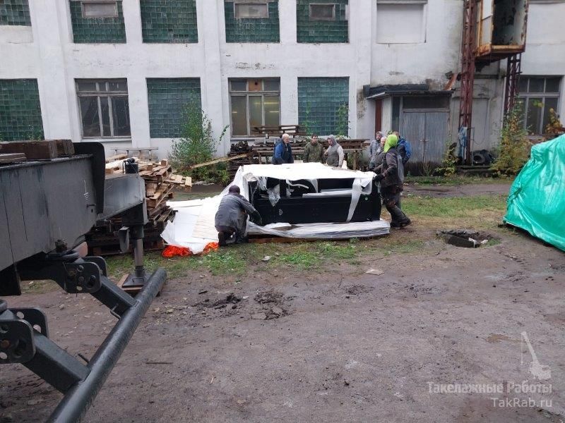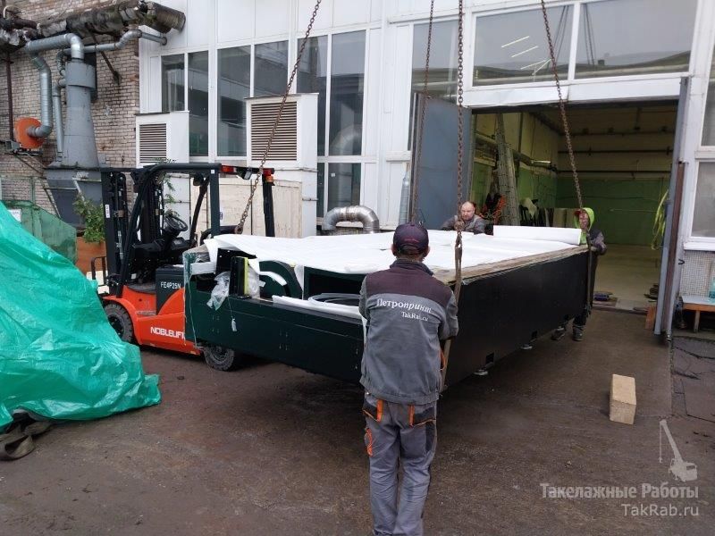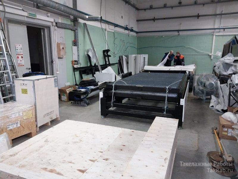 Станок лазерной резки листов состоял из двух крупногабаритных частей и ящиков с комплектующими и оснасткой. Общий вес оборудования составлял порядка 7500 кг. Выгрузку производили на ограниченной территории во дворе предприятия автокраном 25т. С помощью автокрана произвели снятие оборудования с транспортных поддонов. После этого части станка были поданы в транспортные ворота цеха. Перемещение частей станка по цеху осуществлялось в стеснённых условиях. Согласно заданию заказчика части оборудования были расставлены для дальнейшего монтажа.